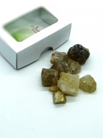 Hochwertige, entgratete Steine. Fair gehandelt. Mindestens 100g in einer recyclebaren Schachtel mit Sichtfenster.